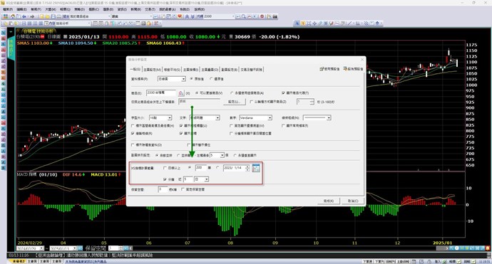 (3)可以自訂指標計算區間,目前是從語法限制,但不同頁面跟商品,實在是要從腳本改太多次了,左下角的日期設定,實際不僅不能使用,而且跑起來超級慢,不知道是否有人可以正常使用?希望能直接從技術分析設定去調整