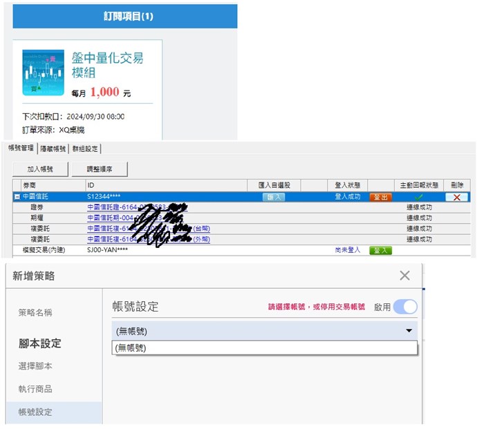自動交易下單,中國信託目前沒有與我們有合作規劃,僅只有在一般下單上有合作,所以自動交易無法選到帳號。