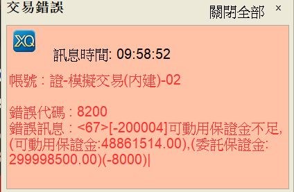 會發生這種狀況,可能是您下單的數量金額超過模擬帳戶裡可用的資金。