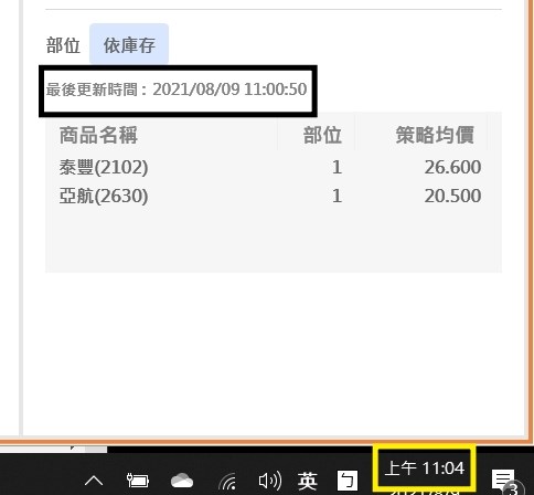 如下圖,泰豐11:00:33秒已成交出場,但電腦到11:04分,庫存都還有泰豐,到11:05才消失