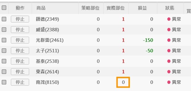 南茂這檔股票,狀態為異常,自動交易的實際部位為0, 但模擬帳戶又有股票