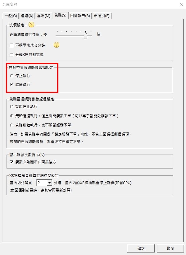 您自動交易停止的原因應為網路斷線造成,您可以設定恢復連線後自動執行,如下圖