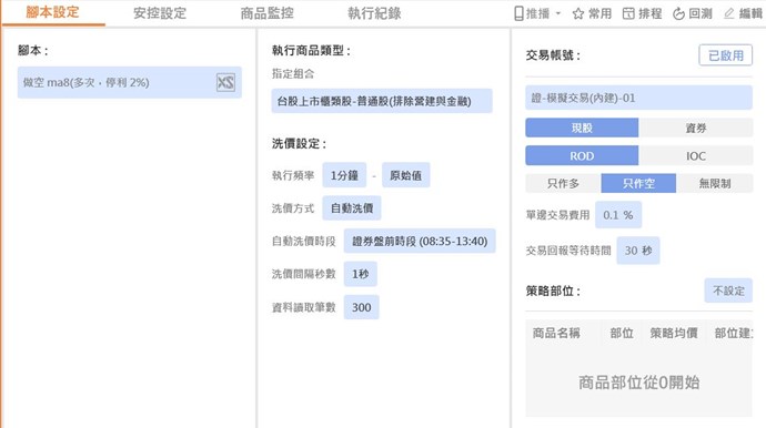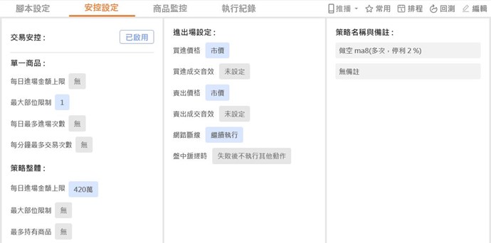 下面附上程式碼以及自動交易中心的設定截圖和執行紀錄,謝謝大家的幫忙!