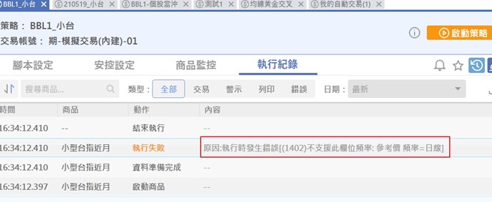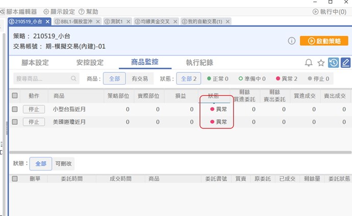 但小台,如下圖都會有商品異常的情形 ,但是個股那個策略卻是可以正常啟動的,想請問小幫手是否有可能哪些地方我沒設定好呢?感謝