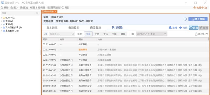 如果您需要進一步的診斷的話,需要麻煩您提供自動交易中心匯出檔、腳本以及XQ Log來檢驗。