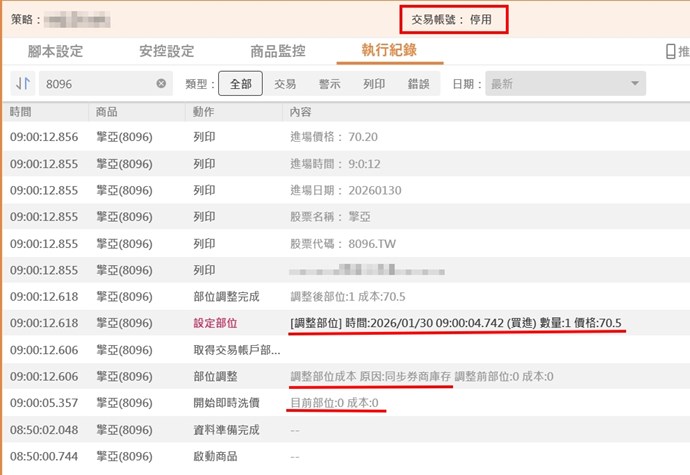 這個就很奇怪了。照理說,沒有啟用帳號,是無法設定策略部位。你這個調整部位的動作是啟用帳號且將『策略部位』選擇『與庫存同步』,又將『庫存異動時同步數值』打勾,才會有的動作。以前的舊版本曾經出現過這種問題,請更新到最新版本再試試看。我猜測,舊版本會出現這種問題,可能是使用者原本啟用帳號,後來又停用帳號,而系統未即時切換所造成。