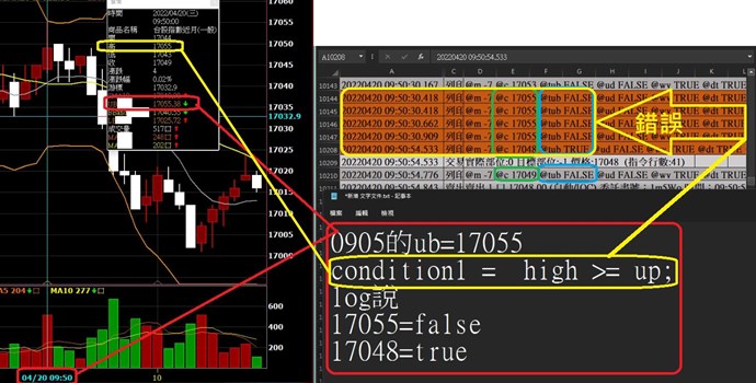 需注意在即時逐筆洗價的時候該根Bar的價位和最終會運算出的 up 都還未確定 (每次洗價都會運算腳本),所以並不一定會等於事後看線圖上計算出的數值。