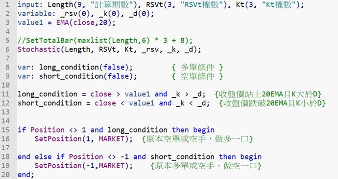 當收盤價站上20EMA 且K值大於D值 則買進一口 (沒有部位或做空的話翻成多單)