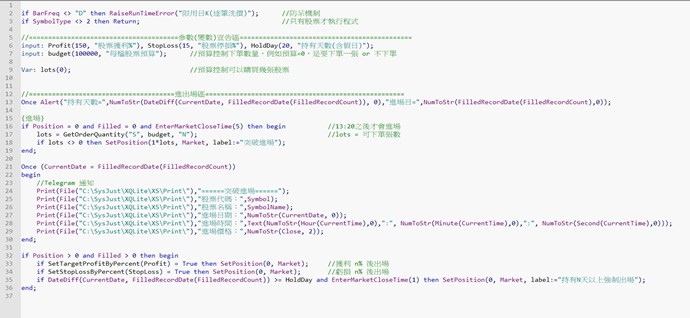 if SetTargetProfitByPercent(Profit) = True then SetPosition(0, Market); //獲利 n% 後出場