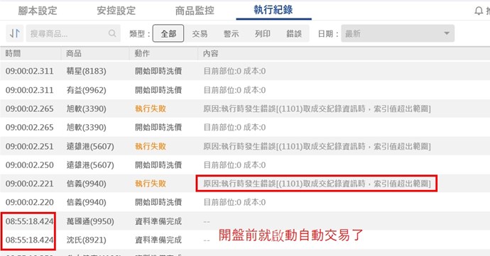 應該是你的程式碼有問題。延續前次執行只有1檔股票8101華冠,錯誤訊息顯示你要抓成交紀錄,很顯然除了這檔以外,其他股票是沒有成交紀錄的。要看看你程式怎麼寫,才知道問題在哪裡。