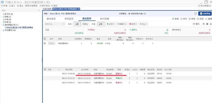 但自動交易系統卻未發出觸發訊號:(下圖8/15 22:00:46 發出多單進場訊後,後面就再沒有訊號了…)