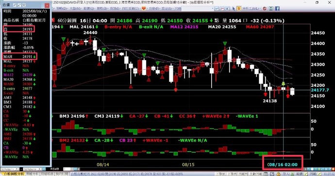昨晚02:00的60分線,高=24193、MAH=24191(→圖中左側),應有符合 價位(當根High=24193) 由上往下穿過 MAH(24191) 形成出場訊(指標即有出現訊號標示→圖中右側K棒上方):