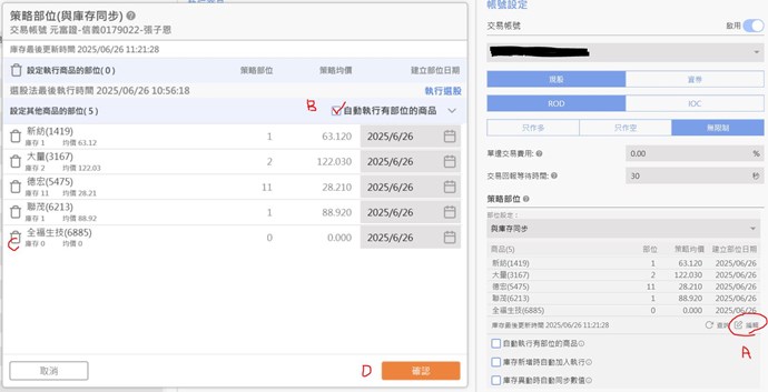因為我有2支作多的策略 下單庫存都在同一個帳號 所以我都會選與庫存同步 然後開啟後再去對哪一支股票 對照哪支策略