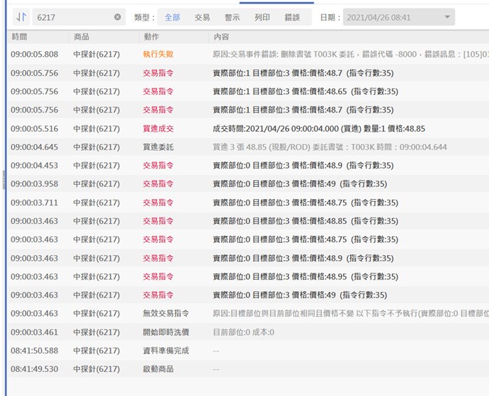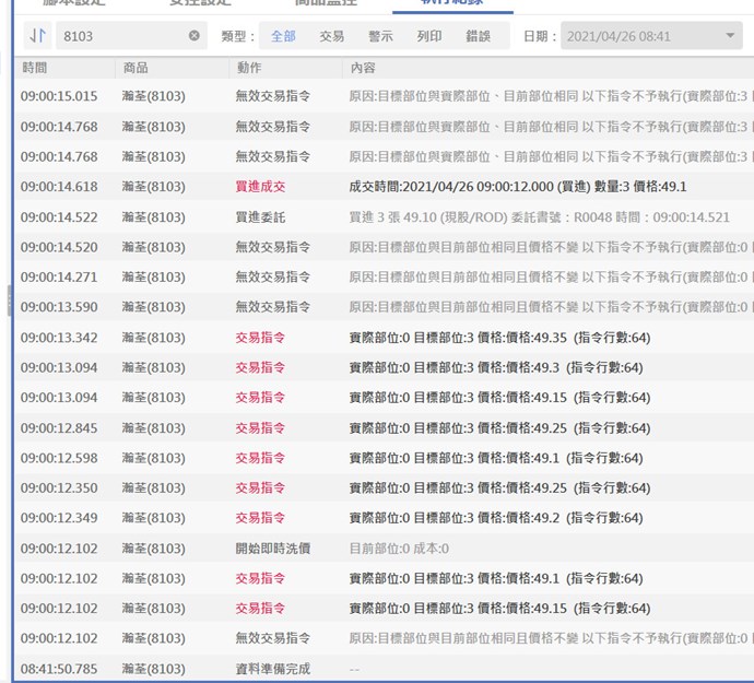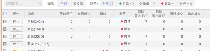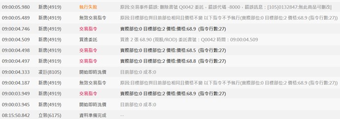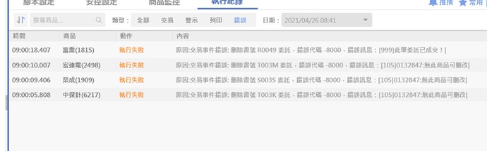 可以得知的是 1414.TW, 2030.TW, 1609.TX 這三樣商品都是因為刪單錯誤導致停止交易,這部分預計在接下來的版本中作修復。