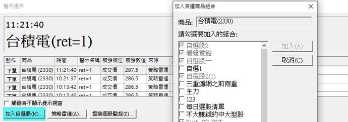 策略雷達跳出警示後,左下方有個"加入自選股"功能