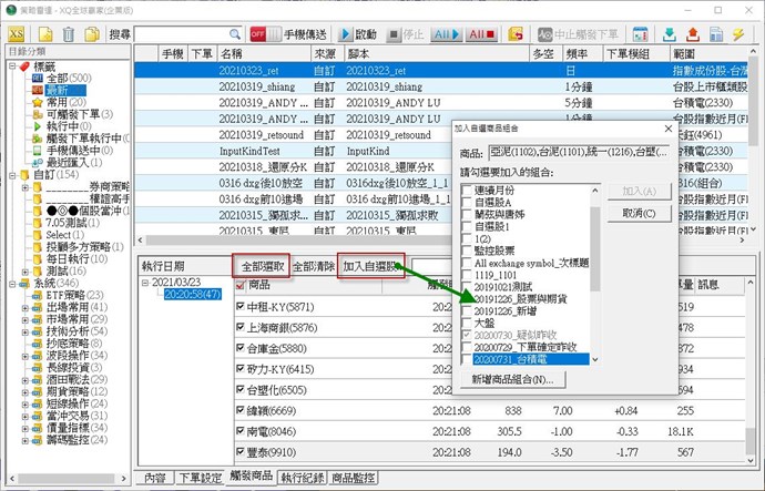 或者在「觸發商品」頁面中全部選取在加入自選股,如下圖,謝謝您的詢問。