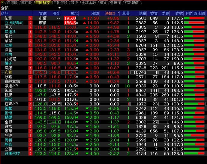 如圖,列出的股票要像「特別報價」那樣,根據漲幅、跌幅、振幅、預估量、成交量,
