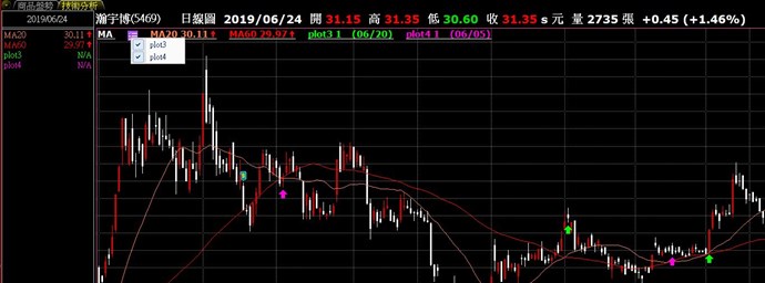 value1= average(close,20); value2= average(close,60); plot1(value1,"MA20"); plot2(value2,"MA60"); if value1 cross above value2 then plot3(1,"穿越") else noplot(3); if value1 cross below value2 then plot4(1,"跌破") else noplot(4);