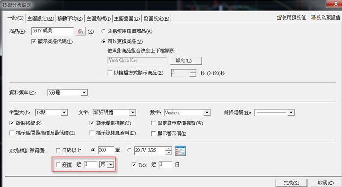 P.S. 指標也許可以在「技術分析設定視窗(Dlg)」將分鐘選項,取消勾選,或許就能跑出來,如下圖紅框處。