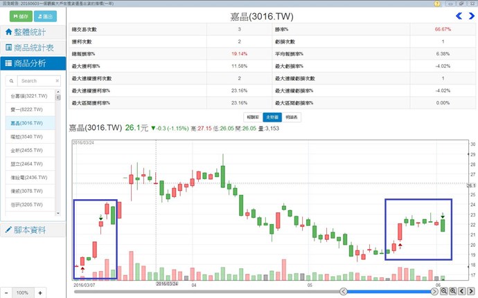 商品分析裡有走勢圖,可看到秀出買進與賣出訊號的K棒走勢圖,如圖藍色框。