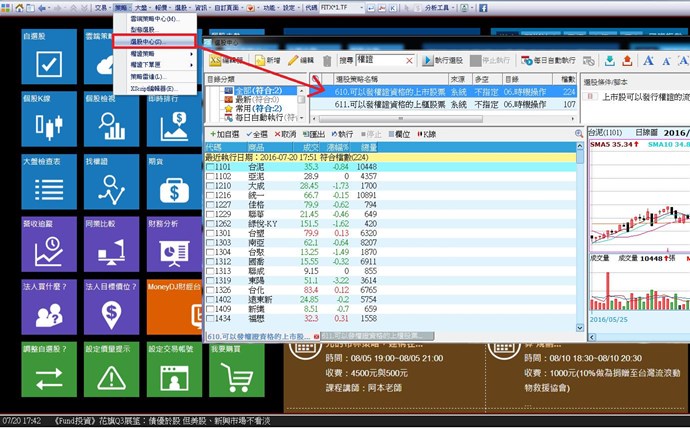 您可以至主功能列-->策略-->選股中心