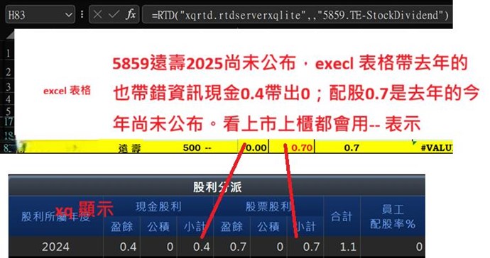 5859 遠壽 2024年現金股利 xq表格內是 =0.4 ,但是excel dde/rtd 帶出來0,也許就這筆錯了吧 嗎???