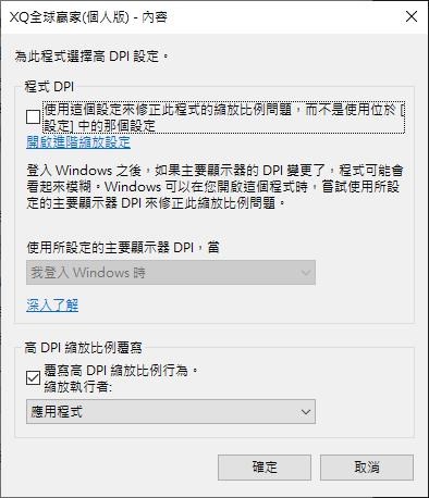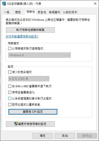 2、請問您的windows系統是什麼呢? 可以試試看打勾下圖選項(在XQ全球贏家(個人版)程式捷徑/右鍵/相容性),看是否有解決問題。