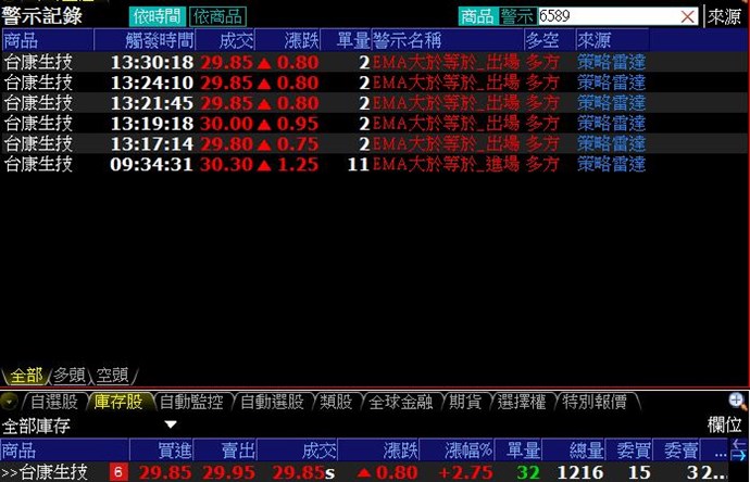 如果有觸發雷達功能,觸發商品頁簽,以及XQ操盤高手的"交易"-->"證券委託查詢",都會看到相關資訊喔。