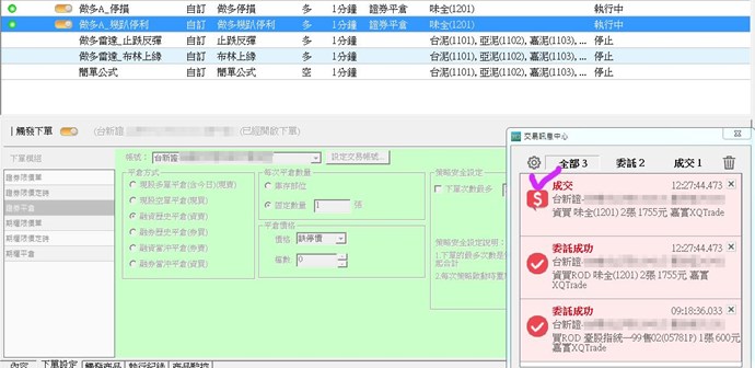 我前2天用新開戶券商帳號,手動資買成功,今天想測試資賣,結果有觸發信號,但沒去平倉QQ