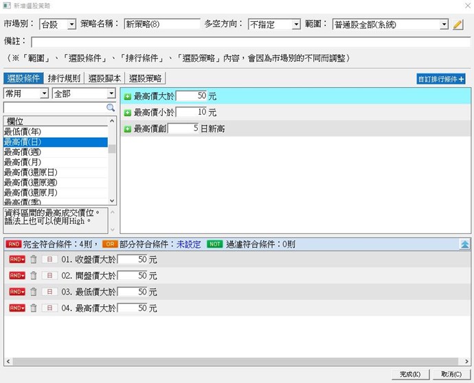 您可以將平常都會使用的欄位判斷增加在一個選股策略上