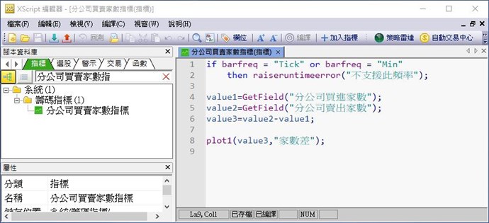 A:在 XS 編輯器的指標類型系統範例「分公司買賣家數」即有範例語法可供參考,如下圖,以上方向供參考,謝謝。
