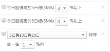input:length_5MA(5,"MA天期"),length_10MA(10,"MA天期"),length_20MA(20,"MA天期"), MA_N1(0,"高於MA幾(%)以上"),MA_N2(3,"高於MA幾(%)以下"),MA_N3(1,"均線糾結幾(%)內"); value1 = average(close,length_5MA); value2 = average(close,length_10MA); value3 = average(close,length_20MA); value4 = maxlist(value1,value2,value3); value5 = minlist(value1,value2,value3); if close >= value1 * ( 1+ 0.01 * MA_N1) and close <= value1 * (1+0.01 * MA_N2) and value4 <= value5 * (1+0.01 * MA_N3) then ret = 1;