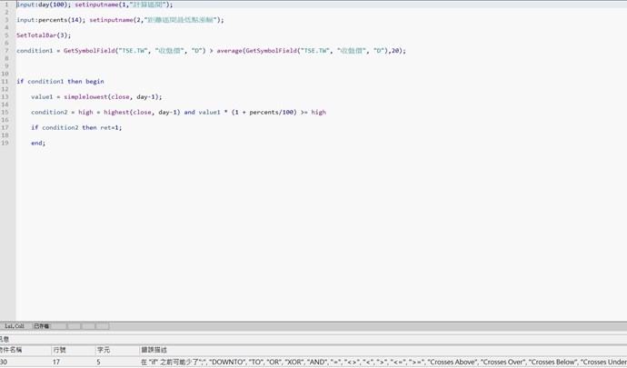 condition1 = GetSymbolField("TSE.TW", "收盤價", "D") > average(GetSymbolField("TSE.TW", "收盤價", "D"),20);