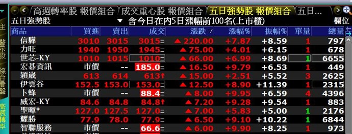 若要盤後排行的話可以參考 如何創造個人排行榜 這篇文章,在函數中計算5日漲幅即可。