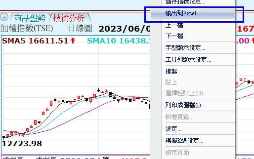 在技術分析圖上的右鍵功能選單, 可以將圖上的指標資料輸出.