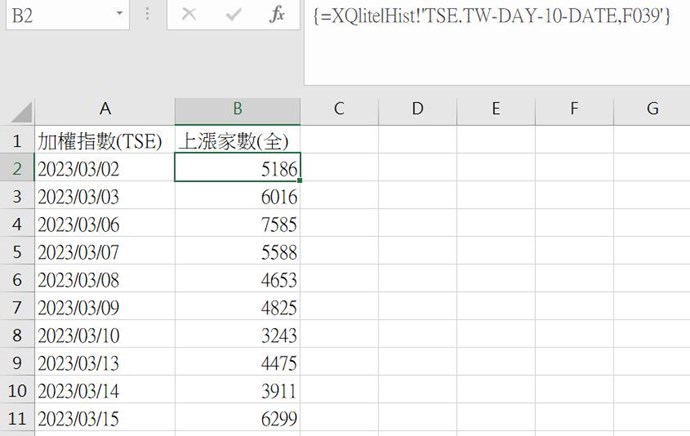 本項歷史資料若要輸出10根日線,請選取「A2:B11」範圍(第一列為自行輸入標題),並輸入「=XQlite|Hist!'TSE.TW-DAY-10-DATE,F039'」後,以 Ctrl+Shift+Enter 輸入公式。