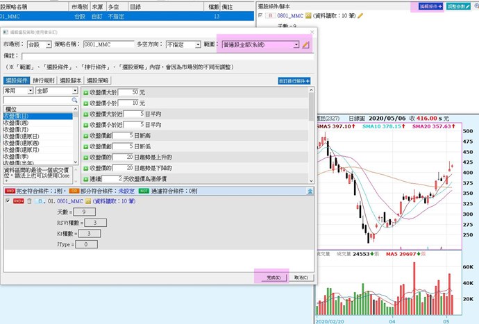 請您選擇那個選股策略,然後點選"編輯條件+",然後選擇"普通股全部(系統)",並且點選完成。
