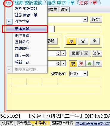 您好,可以使用「新增頁籤」功能來加入多頁籤,在「XQ交易」的欄框設定精靈可以選擇您所需要的功能,逐一進行設定。