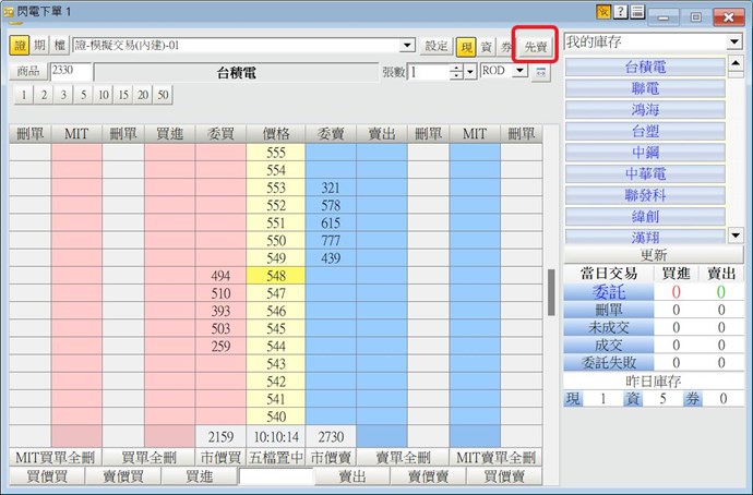 => 若沒有該標的庫存,點選賣出,送單時系統會提示「庫存不足」無法執行。若是要現股當沖先賣,請勾選"先賣"。
