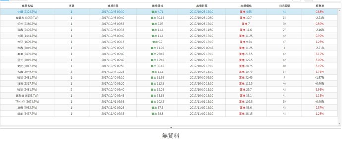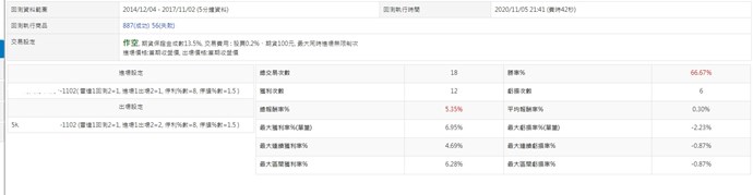 第二段,2014/12/4~2017/11/2,交易分析顯示回測只到2017/10/25,只跑出18筆交易