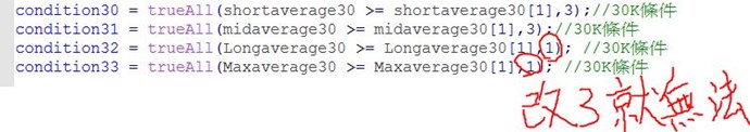 您好,目前遇到一個問題是如果我把程式碼的condition32 condition33的期數由1改成3回測就會測不到9/5號的標的6552照理說9/5 9點20分應該是會有訊號的但是期數只要改3就測不到,但是因為我想寫30分K的均線是上揚的,而我頻率昰5分K,所以照理說30分K的5MA 10MA 20MA 30MA均線要上揚是不是期數要設跟前6期的數值相比(我的想法是5分K裡面前6期應該就是前30分鐘)?可是只要期數改6就一堆標的不會觸發,現在狀況是65529/5號,我連期數改3也不會觸發