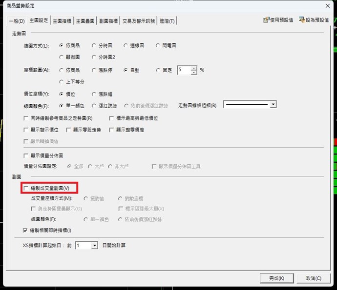 在即時指標點擊滑鼠右鍵,選擇『設定』,以滑鼠左鍵點擊『主圖設定』分頁,將『副圖』區塊的『繪製成交量副圖』取消打勾即可。
