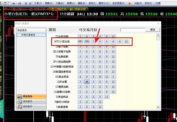 您好,下圖箭頭指示為小台指期近月商品。謝謝!