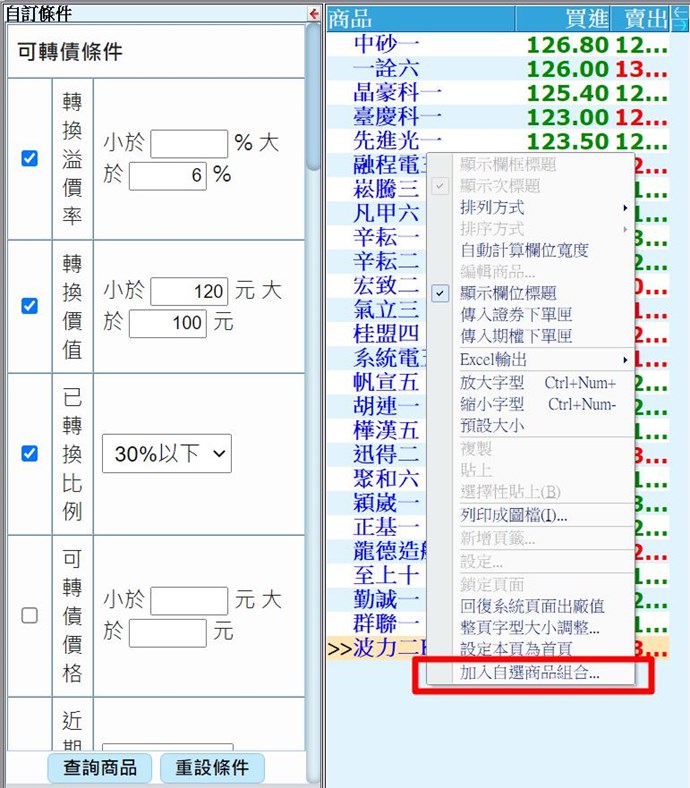 您好,在可轉債篩選頁面,在篩選出標的的上方按「右鍵→加入自選商品組合」,可開啟自選商品組合對話盒,或是在該頁面(不要選到商品)點按「右鍵→加入自選商品組合」,可以批次加入該頁所有商品至自選商品組合。