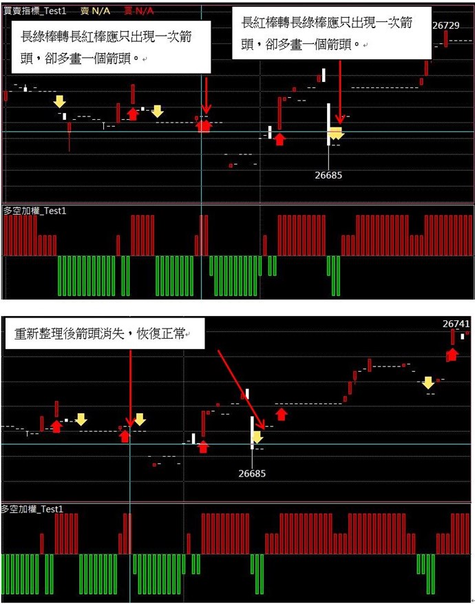 我寫了一個類似黃金交叉或死亡交叉的判斷式,並同時在主圖上標示出買賣箭頭,經過多日測試,總是不定時會出現一些多餘箭頭問題(經過重新整理就恢復正常),如下圖,我已經先參考了討論區有可能的解決方式,程式碼都有使用noplot指令。請問有辦法徹底解決這種不定時的指標誤畫問題嗎?