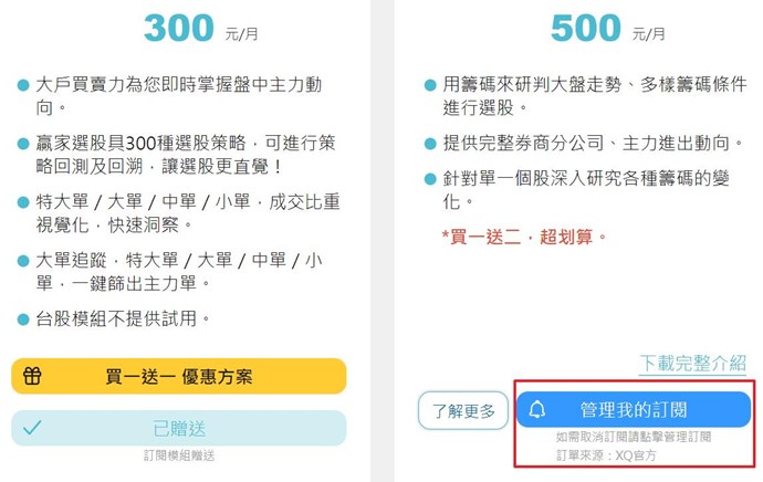 請在已訂閱的模組先點選“我要訂閱”,登入您的XQ帳密後,會有出現「管理我的訂閱」連結,如需取消訂閱請點擊管理訂閱(如下圖示以“籌碼模組”舉例)