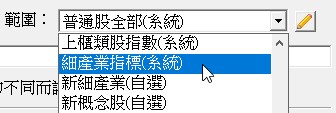 選股中心的「範圍」,下拉選單有「細產業指標(系統)」,也可以將 族群透視 的資料用 EXCEL 匯出,再加入自選商品組合,成為選股範圍,見下圖所示: