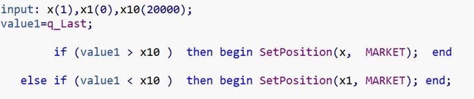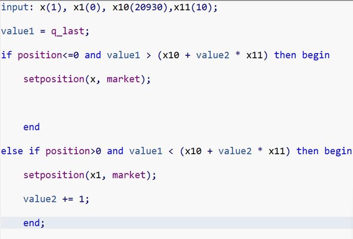 value2 會隨著腳本每次平倉時增加,這樣 (x10 - value2 * 100) 就會跟著遞減, 接著在第五次以後就會中斷。