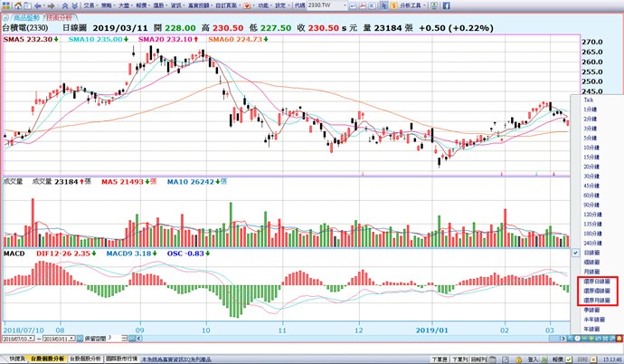 您好,目前技術分析圖的資料頻率,可更改為「還原日線/週線/月線圖」