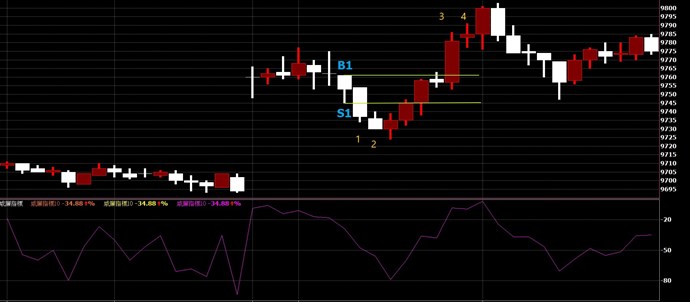 標示1的K棒收破S1的價位,所以標示2的K棒開盤就買進